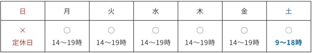 | × 定休日 | ◯ 14〜19時 | ◯ 14〜19時 | ◯ 14〜19時 | ◯ 14〜19時 | ◯ 14〜19時 | ◯ 9〜18時 |
